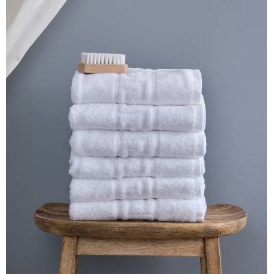 Βαμβακερή υπέρλευκη Πετσέτα δίκλωνη πενιέ, από μακρόινα νήματα με ανάγλυφη, ριγέ φίνα μπορντούρα. Παχιά, με βελούδινη απαλότητα, έξτρα απορροφητική & φιλική με το δέρμα. Πλαϊνό διπλό γάζωμα για αντοχή & ασφάλεια στα συνεχή πλυσίματα. Αποτελεί μία κορυφαία, ποιοτική επιλογή ακόμα και για τους πιο απαιτητικούς πελάτες σας.